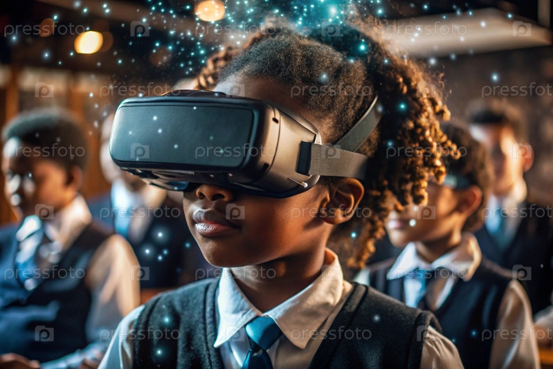 Чернокожая африканская девушка с очками виртуальной реальности.Ребенок находится в классе, а другие ученики на заднем плане.Цифровой интерфейс отображается в наушниках