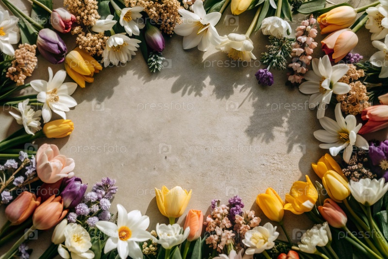 Красивый цветочный фон. Рама весенних цветков с тюльпанами, нарциссами, крокусами, гиацинтами. Вид сверху. Пространство для текста
