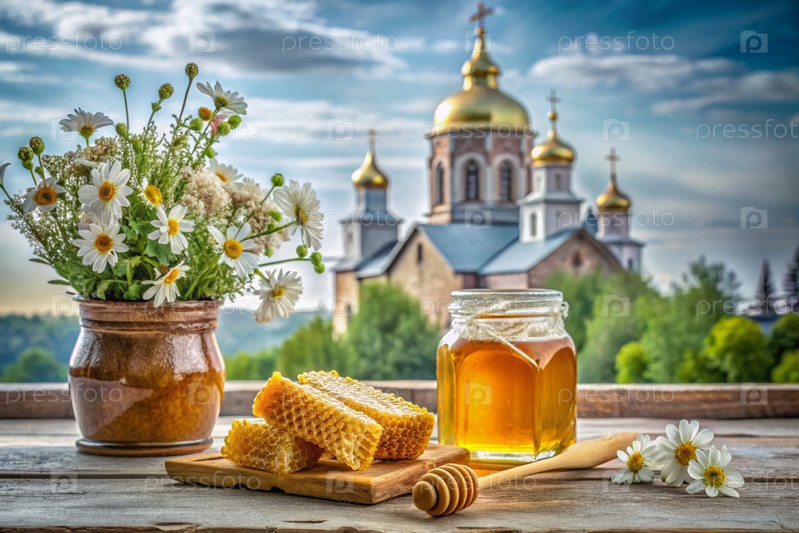 Концепция российского православного праздника 'Мёд Спаситель'.Стеклянная кружка с медом, сосны и букет диких цветов на фоне Православной церкви