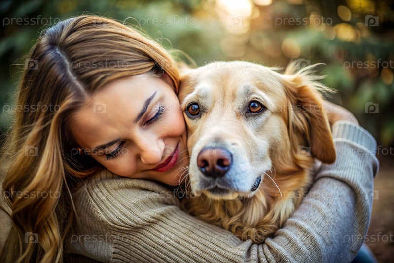 Животные.Молодая женщина обнимает собаку.Сознательная жизнь с питомцем, понятие дружбы и любви к животным