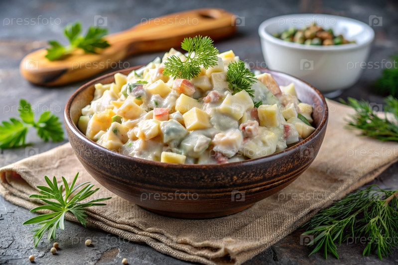 Традиционный русский салат Оливье для празднования на тарелке на деревянной столешнице. генератив AI