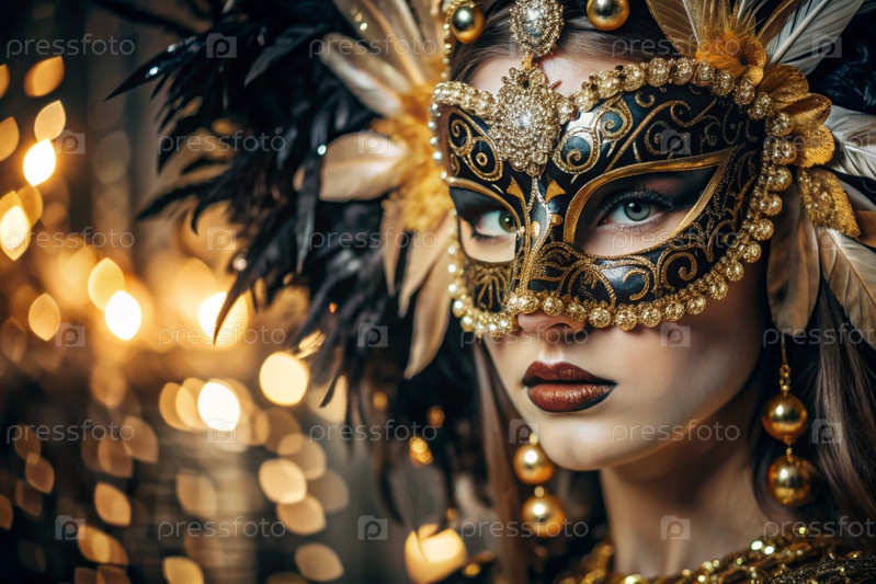 Карнавал Венеции.Закрытие женщины в украшенной карнавальной маске.Яркие цвета передают атмосферу празднования и роскоши
