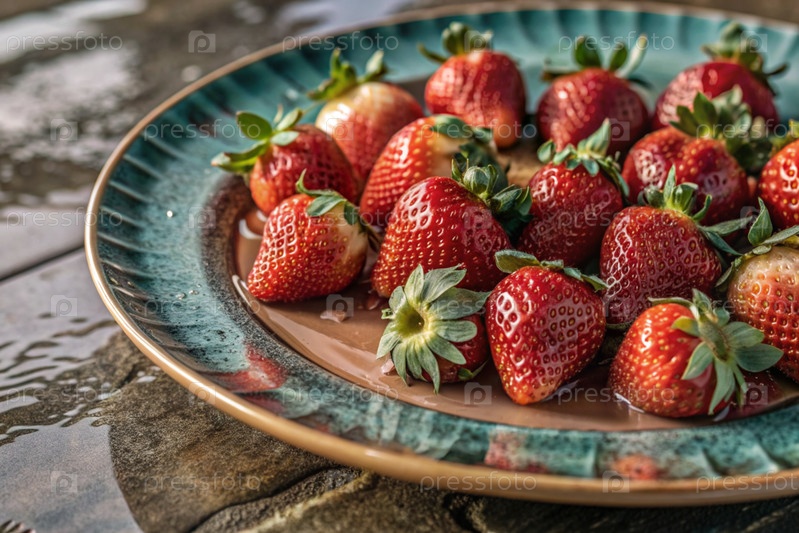 Закрытие свежих клубники. Вкусные ягоды и фрукты ярко-красные с капельками воды. Вегетарианство. Здоровое питание. Свежие плоды на столе
