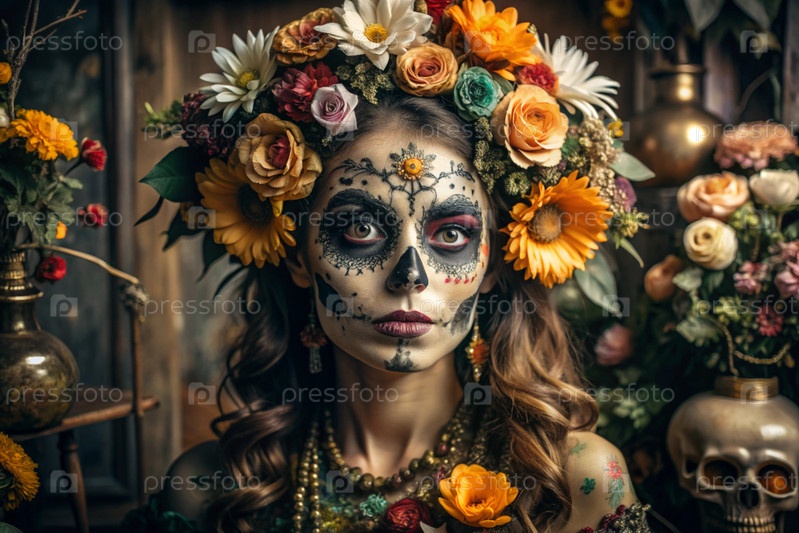 Концепция Хэллоуина. Ужасно. Костюмированная вечеринка. Красивая женщина с покрашенным черепом на лице и цветами на голове. Баннер, открытка