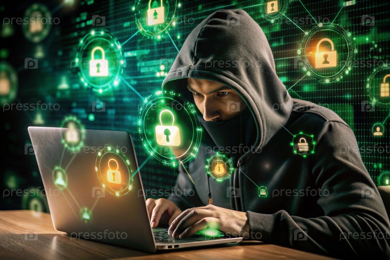 Хакер работает на ноутбуке, цифровые коды на виртуальном фоне. взлом и защита онлайн-данных. цифровые технологии, разработка программного обеспечения