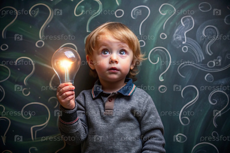 Развитие и образование детей. вдумчивый мальчик на темном фоне с лампочкой и вопросительными знаками. мозговой штурм и концепция идеи