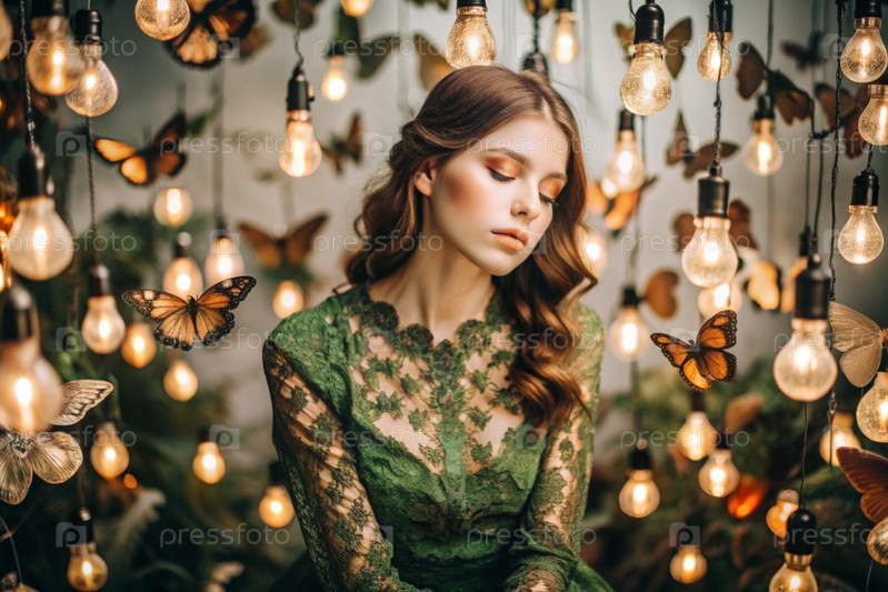 Портрет красивой девушки в зеленом платье среди многих подвешенных лампочек и бабочек, размахивающих вокруг нее