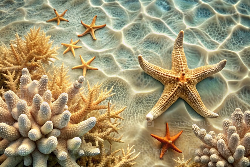 Концепция летних каникул. Подводный мир. Кораллы и морские звезды под водой. Красивый абстрактный фон для баннера