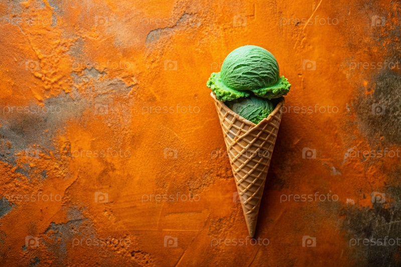 Сладкий десерт. Стильная современная концепция. Зеленый конус мороженого на ярко-оранжевом фоне. Всемирный день мороженого