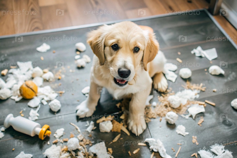 Виновный смешной щенок, ретривер-собака, разбитая комната, порванные игрушки, подушки и бумага, бардак в гостиной