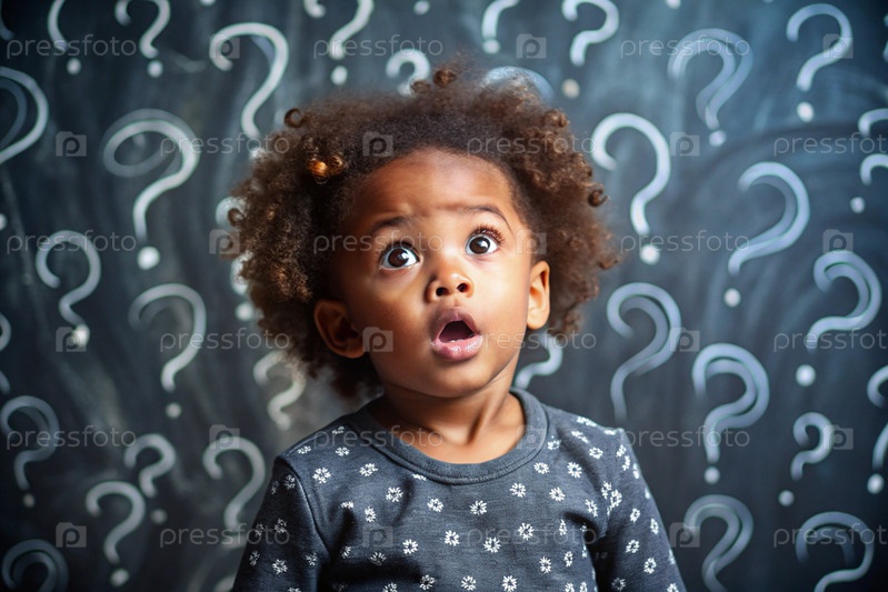 Развитие и образование детей. удивленная афроамериканская чернокожая девушка на темном фоне с вопросительными знаками. мозговой штурм, вопросы детей и концепция идеи