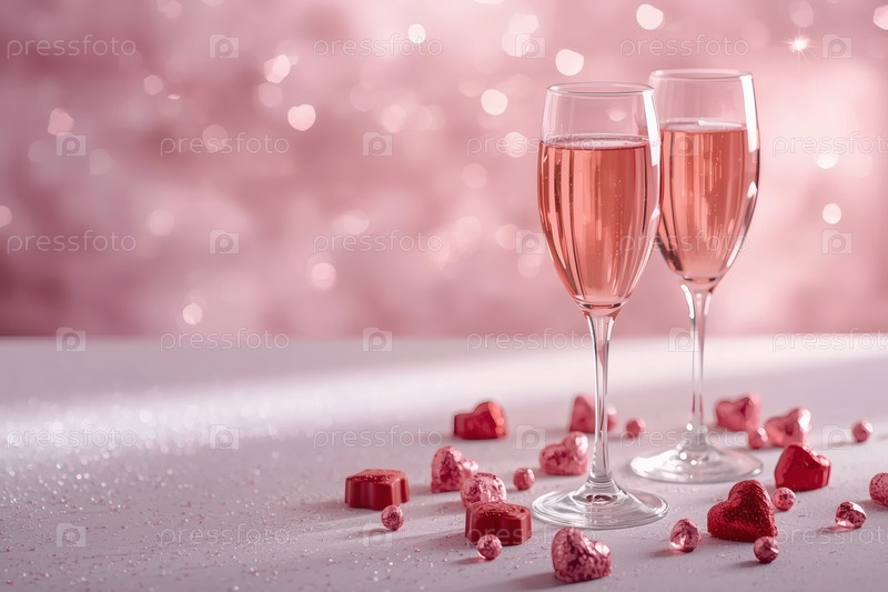 Два бокала розового вина и шоколада в окружении роз и сердец на День святого Валентина