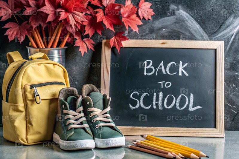 Праздник приходится на 1 сентября. Рюкзак, кроссовки и карандаши. Знак 'Возвращение в школу' на доске. Концепция нового учебного года в школе. Давайте вернемся в школу. День осенних знаний