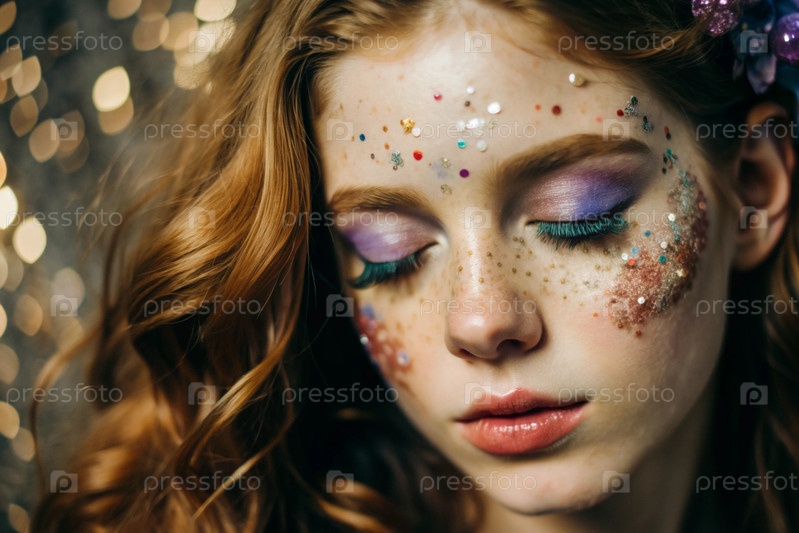 Покрытие лица девушки праздничным макияжем и ленточками.Изображение придает ей сказочный и мистический вид.Концепция новогодней ночи или дня рождения