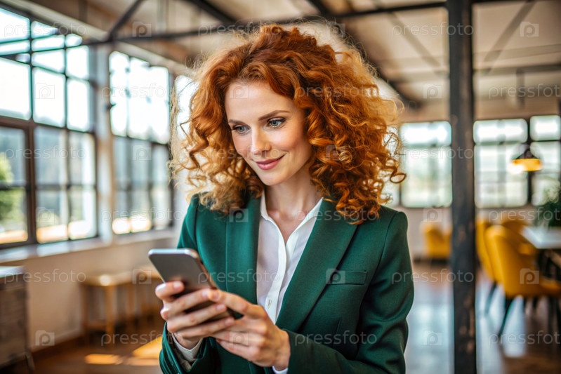 Деловая женщина с локонами красных волос и веснушками. Она одета в обычное зеленое пиджак. В руках смартфон. Небольшой бизнесмен смотрит на свой мобильный телефон