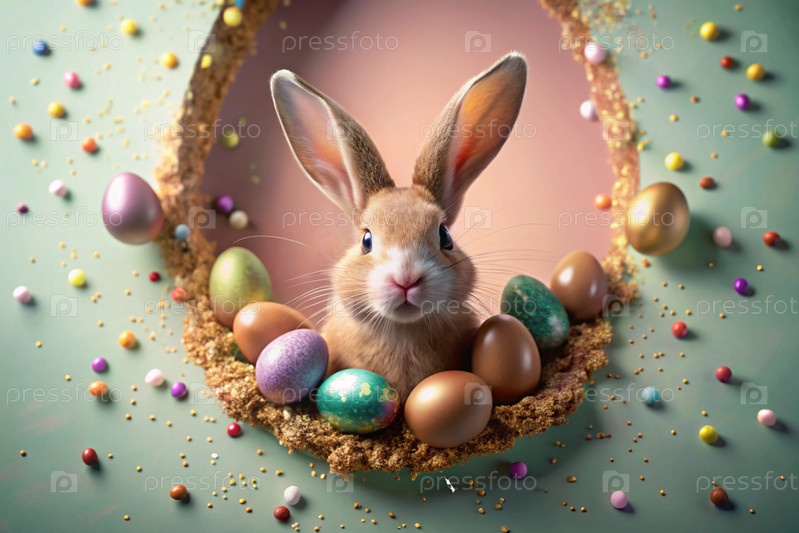 Известный праздник. милый пасхальный кролик заглядывает из ямы с красочными яйцами вокруг. концепция счастливой Пасхи