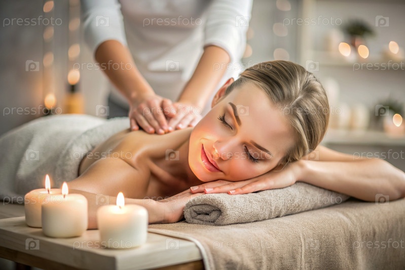 Баннер для профессиональных массажных салонов.Молодая, красивая блондинка наслаждается массажем в современном спа при свечах.Освобождение и гармония, уход за телом