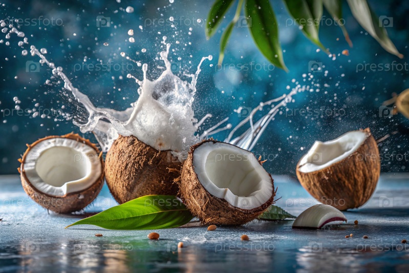 брызги кокосового молока и пальмовых листьев. Брызги молока - кокосы на синем фоне. Баннер для сладостей, курортной косметики или кремов по уходу за телом и лицом