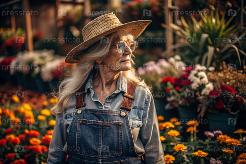 Пожилой садовник с седыми волосами в комбинезоне в уютной цветочной теплице