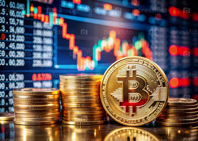 Криптовалюта. Золотые монеты - это биткойны с обменным курсом на виртуальном экране. Падение Биткоина. Красная стрелка указывает вниз. Изображение, созданное с использованием искусственного интеллекта