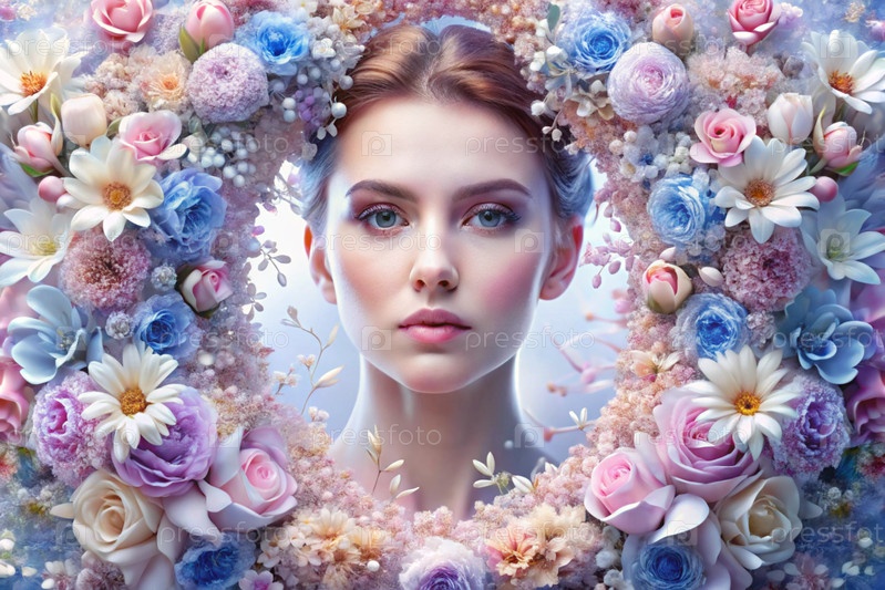 Международный женский день. баннер, флаер. весенний портрет красивой женщины с венок цветов на голове в нежных синих и розовых цветах