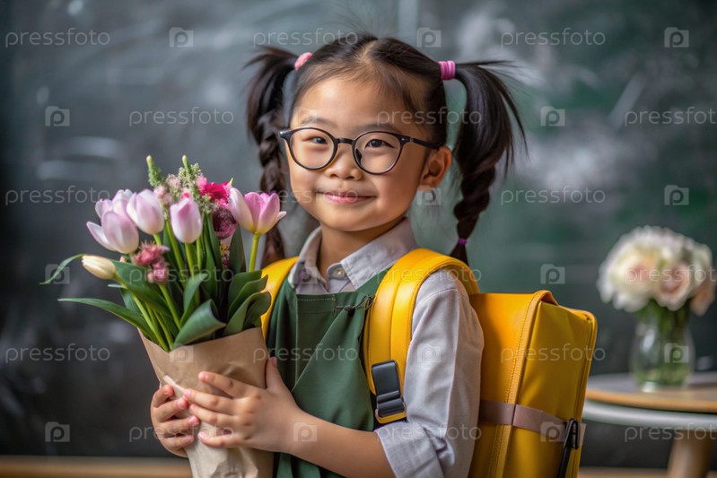 Первоклассный азиат с очками на доске. Девушка держит цветы в руках. Ребенок пойдет в школу впервые. Ребёнок с рюкзаком, книгой и цветами. Возвращение к школе