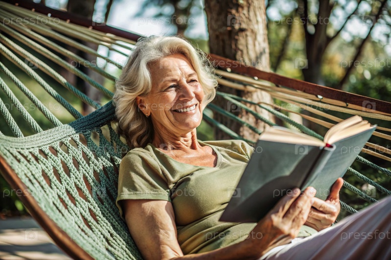 Пожилая пенсионерка, современная бабушка в очках, читает книгу на каникулах в гамаке у моря при естественном свете