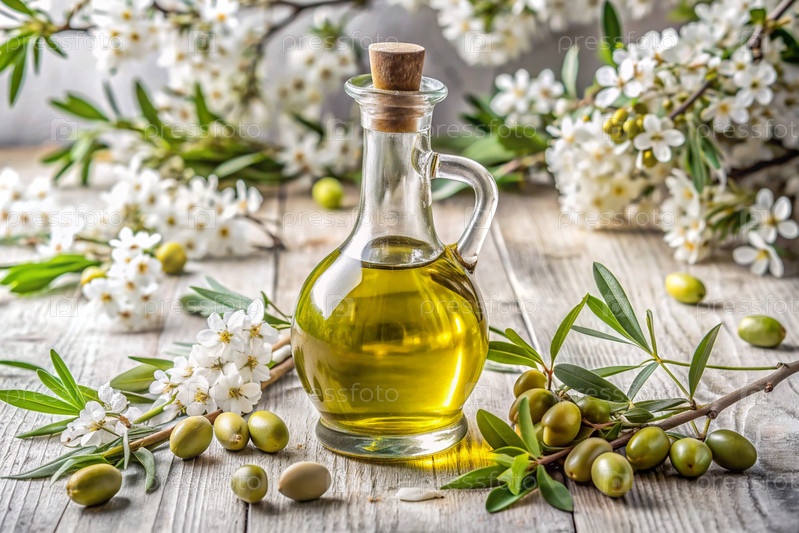Оливковое масло в красивой бутылке со свежими маслинами и цветущими оливковыми ветвями на светлом фоне
