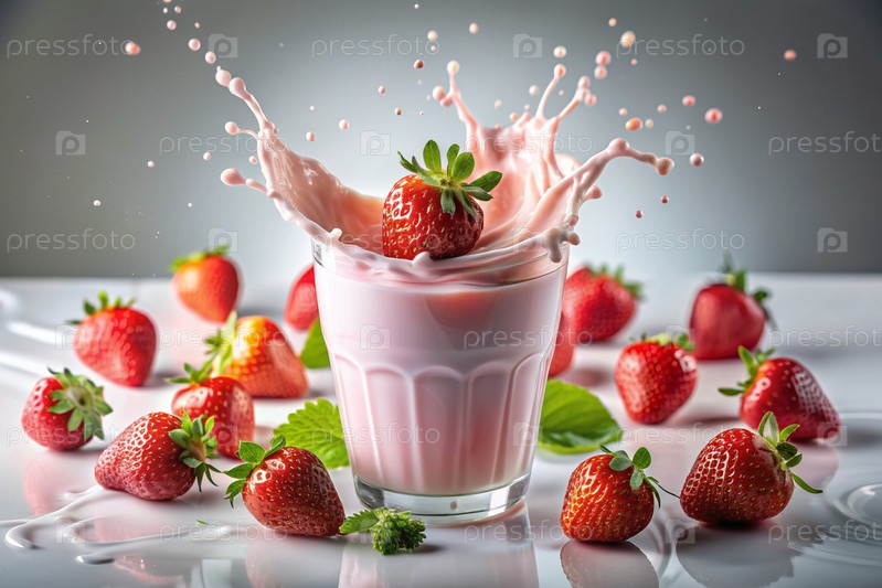 Творческий кулинарный рисунок. ближайшее наполнение клубники, клубника в стакане молока, розовый милкшейк, коктейль йогурта с жидкими каплями на белом фоне