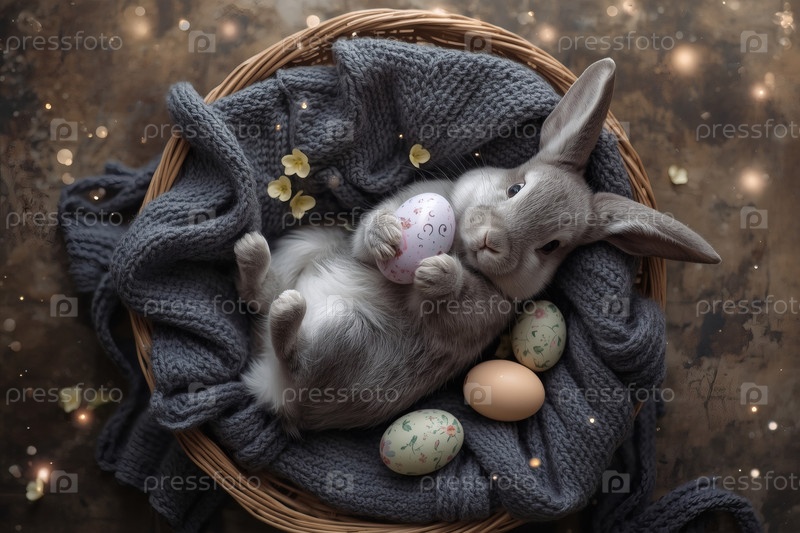 Пасхальный кролик держит пасхальное яйцо в лапах, лежит на спине на сером вязанном одеяле и смотрит в камеру