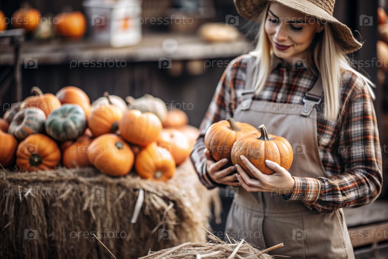 Руки женщины в квадратной рубашке с тыквенным крупным планом и красивым осенним рисунком. Сбор тыков. Концепция празднования Дня благодарения и Хэллоуина