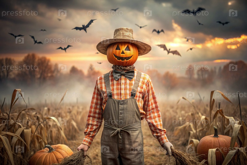 Концепция Хэллоуина. Ужасная. Страх. Устрашающий богий с тыквенной головой, квадратной рубашкой и бабочкой. Баннер, открытка