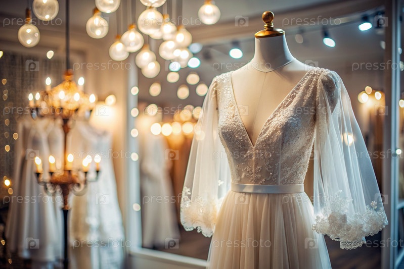 Аренда и покупка свадебных платьев для мероприятий. Близкие. Элегантное белое свадебное платье на манеке в роскошном брачном салоне