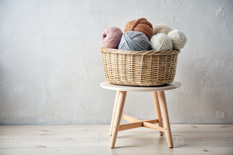 шарики пряжи в корзине из плесеня в белых и бежевых тонах швейная работа, текстиль, вязание зимний сезон, малый бизнес, ручная одежда