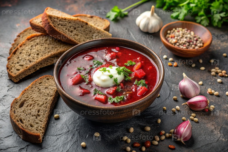 Традиционный украинский и российский борщ в стильной керамической тарелке с травами, сметаной и чесноком