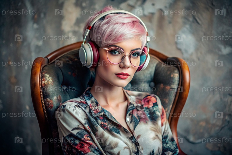 Молодая красивая девушка с розовыми волосами слушает музыку в больших беспроводных наушниках дома, на стуле в гостиной