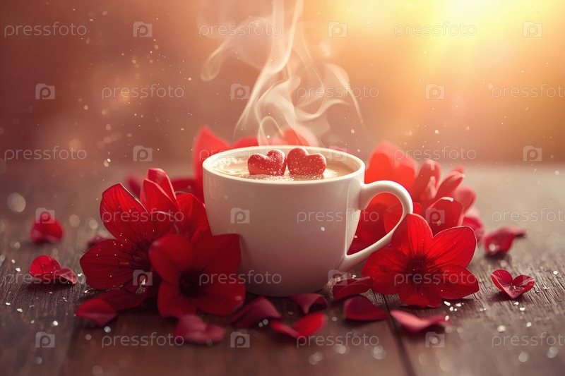Чашка горячего кофе или чая, окруженная красными цветами и сердцами в День святого Валентина