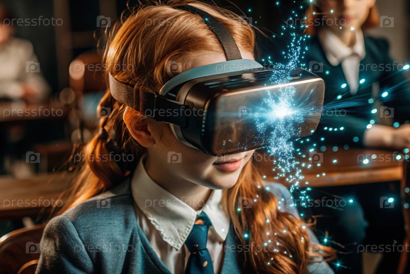 Девочка с очками виртуальной реальности. Ребенок находится в классе, а другие ученики на заднем плане. Цифровой интерфейс отображается в наушниках