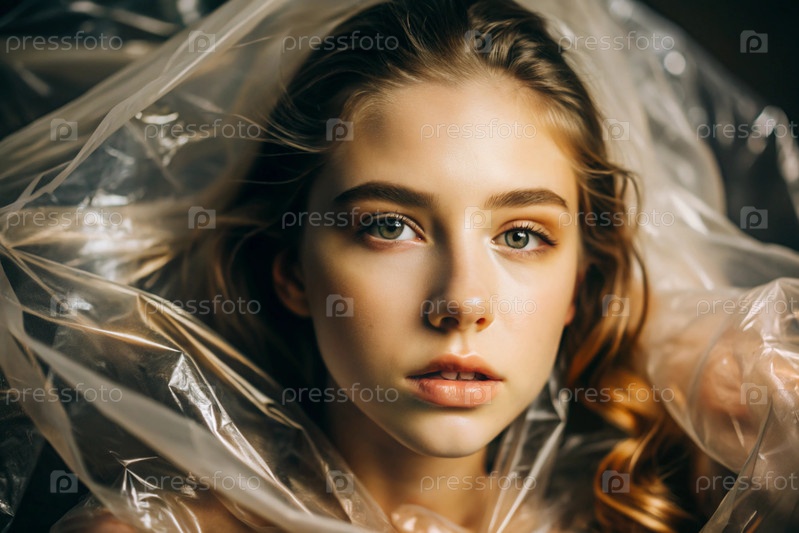 Девочка завернута в целлофан или сумку. Девушка задыхается. Пластиковое загрязнение планеты. Опасность для окружающей среды. Сокращение повторного использования пластика. Переработка. Концепция мусора