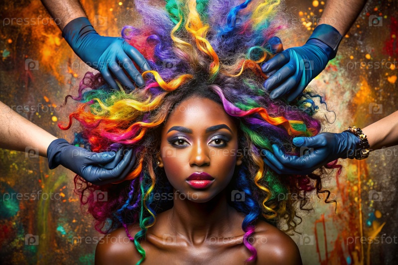 Творческий баннер для салона красоты или парикмахера. Модное профессиональное окрашивание волос. Красивая чернокожая афроамериканка с длинными многоцветными волосами. Взрыв цветов на голове