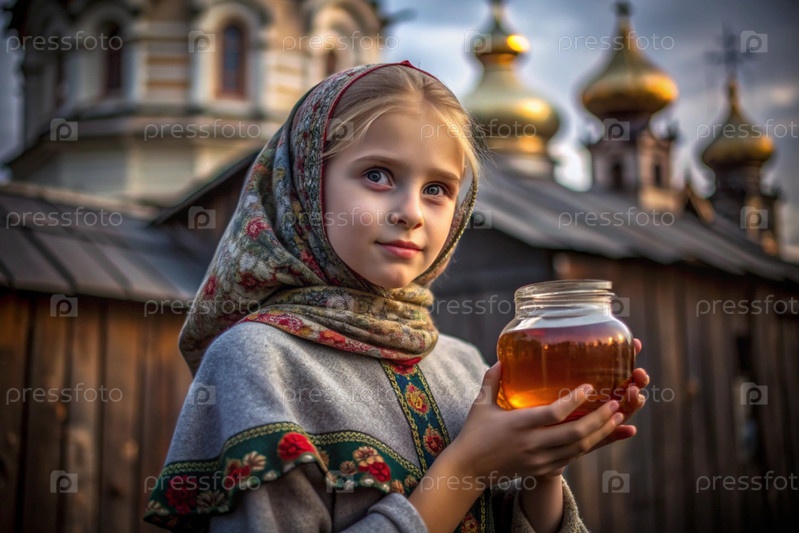 Концепция российского православного праздника 'Мед Спаситель' - красивая маленькая девочка в русской национальной одежде и шарф с баночкой меда на фоне православной церкви