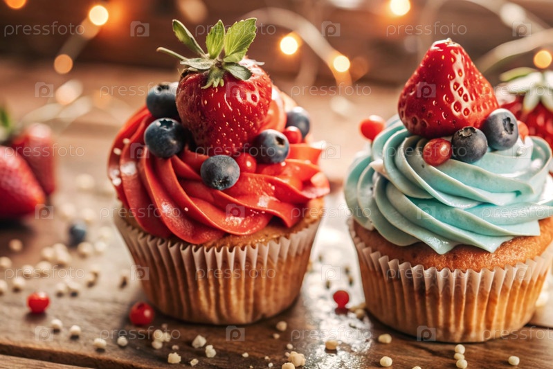 Вкусные красочные кексы со земляницами и чернилами. праздничный кекс, который идеально подходит для веселых торжеств. счастливого дня рождения
