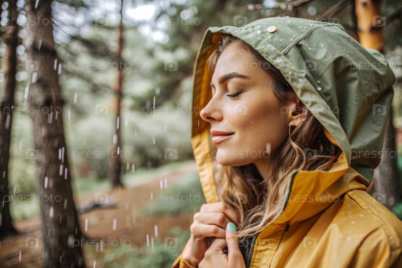 Счастливая молодая женщина в плаще наслаждается дождем на фоне зеленого леса, концепцией наслаждения естественной спокойной жизнью, окружающей средой, образом жизни