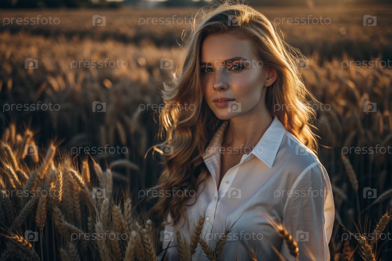 Молодая девушка в белой рубашке с золотыми волосами стоит на поле спелой золотистой пшеницы при закате солнца.Урожай, сельская природа и жизнь