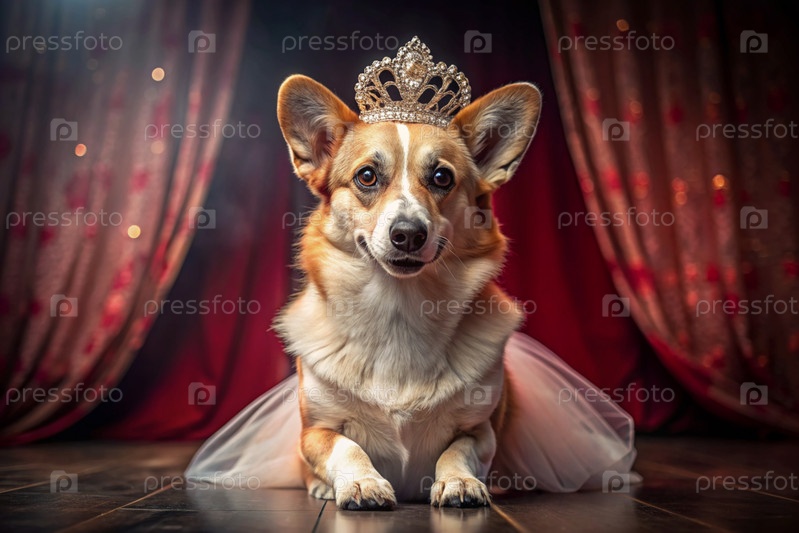 Красивый портрет симпатичной красной валлийской собаки Корги, одетой в розовое туту и с короной на голове