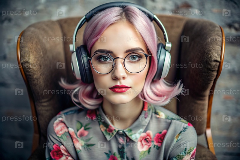 Молодая красивая девушка с розовыми волосами слушает музыку в больших беспроводных наушниках дома, на стуле в гостиной
