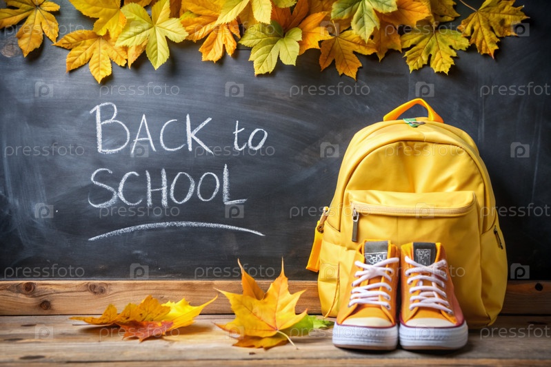Праздник приходится на 1 сентября. Рюкзак, кроссовки и карандаши. Знак 'Возвращение в школу' на доске. Концепция нового учебного года в школе. Давайте вернемся в школу. День осенних знаний