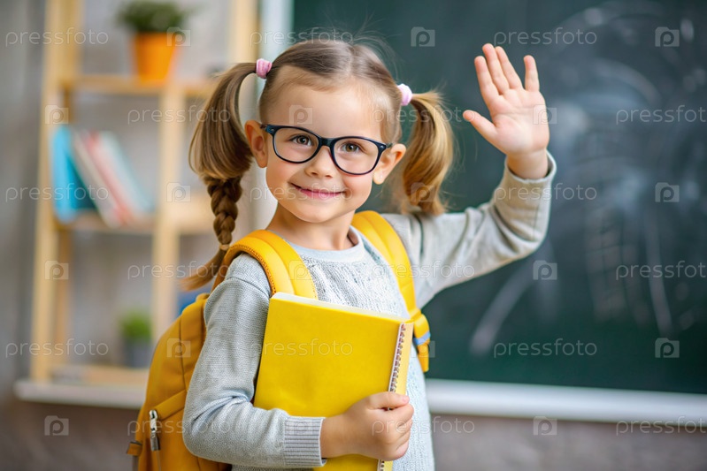 Красивая девушка в очках показывает класс своей рукой. Ребенок идет в школу впервые. Ребёнок с школьной сумкой и книгой. Ребенок в классе со доской на заднем плане. Назад в школу