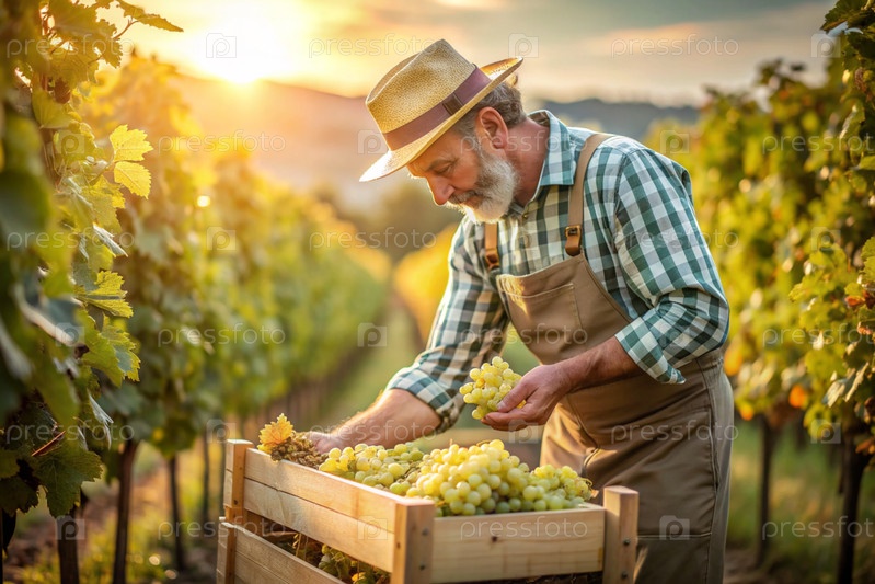 Сельскохозяйственная промышленность. Производство вина. Деревянный ящик с виноградом в руках фермера-мужчины. Садовник собирает богатый урожай. Ближе, солнечный свет. Осенний плодовый сбор
