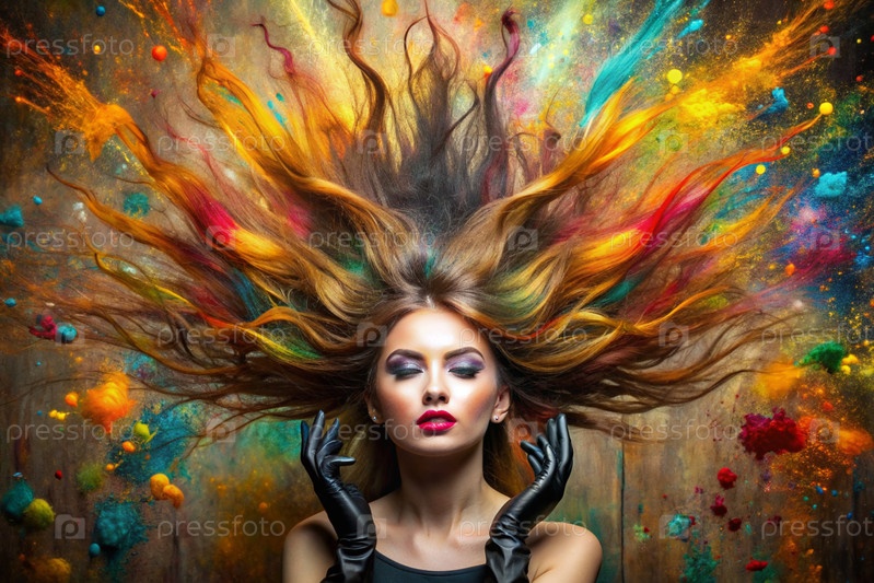 Творческий баннер для салона красоты или парикмахера. Модное профессиональное окрашивание волос. Красивая женщина с длинными многоцветными волосами. Взрыв цветов на голове